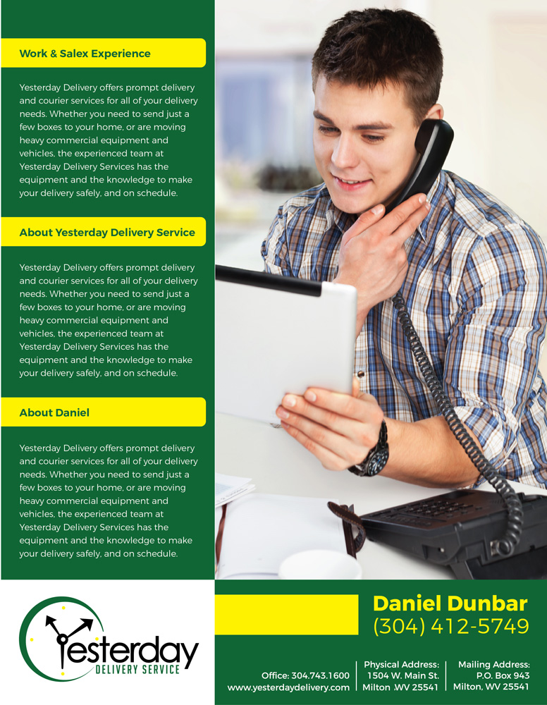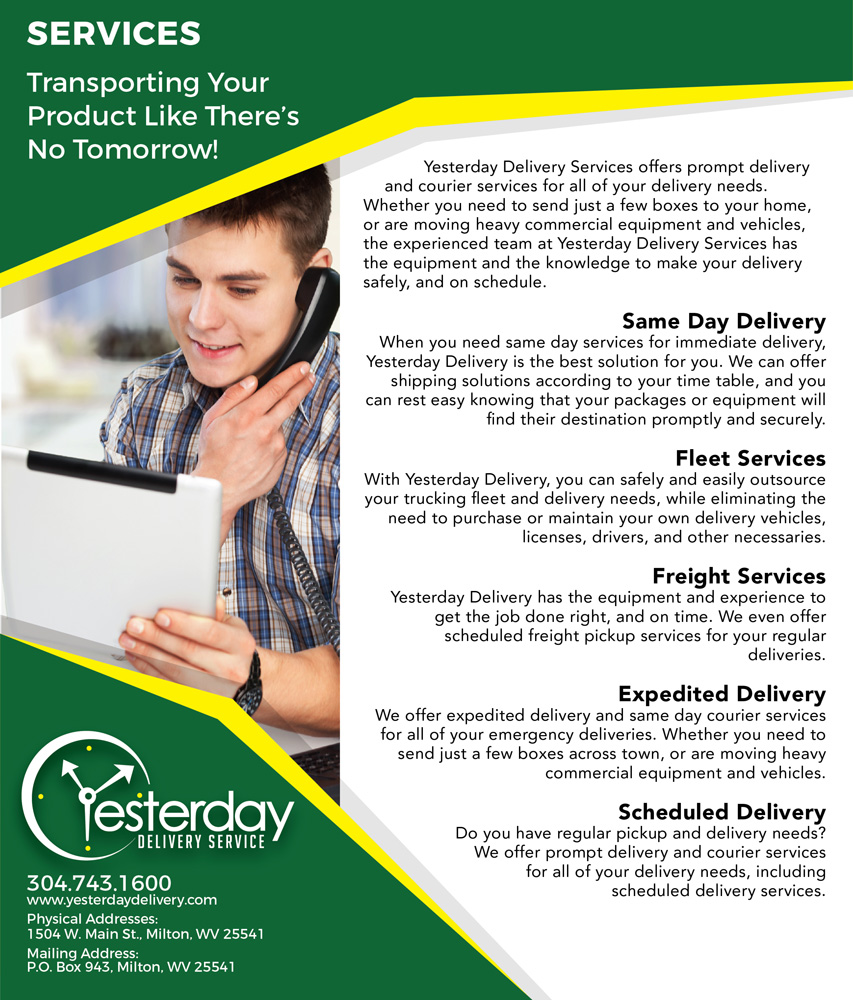 Yesterday Delivery Services offers prompt delivery and courier services for all of your delivery needs. Whether you need to send just a few boxes to your home, or are moving heavy commercial equipment, the experienced team at Yesterday Delivery Services has the equipment and the knowledge to make your delivery safely, and on schedule.
