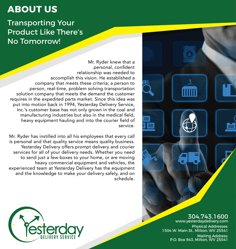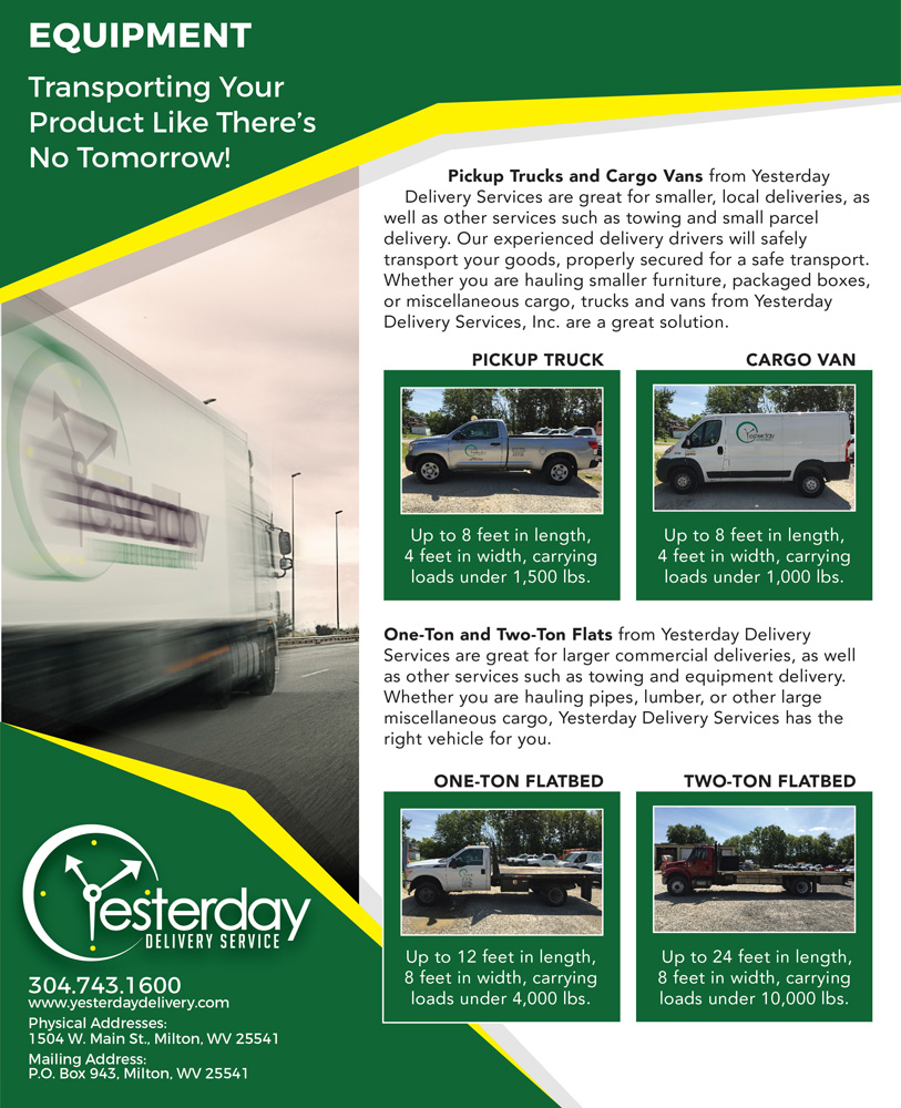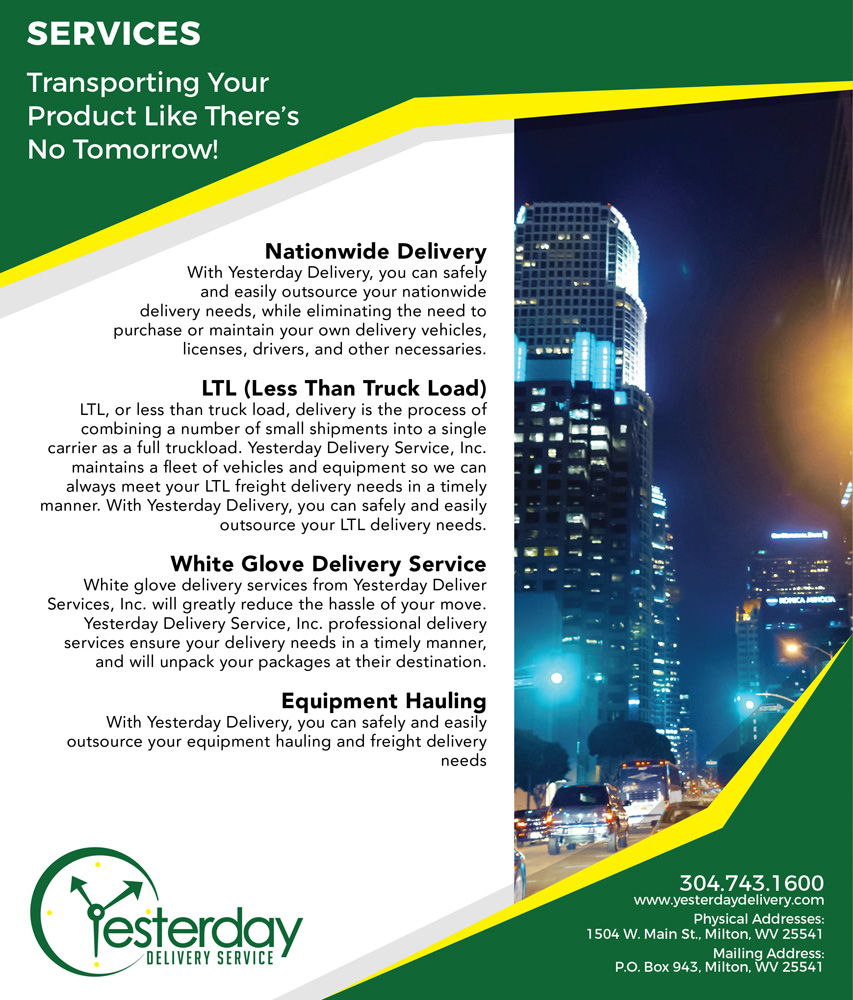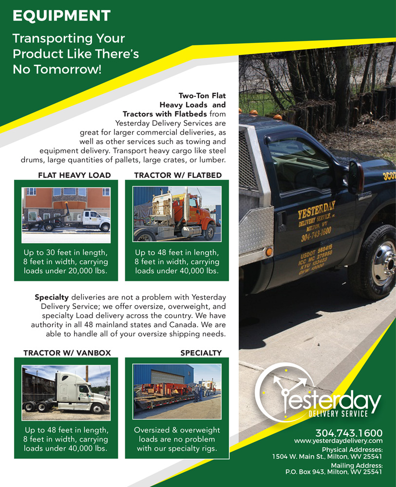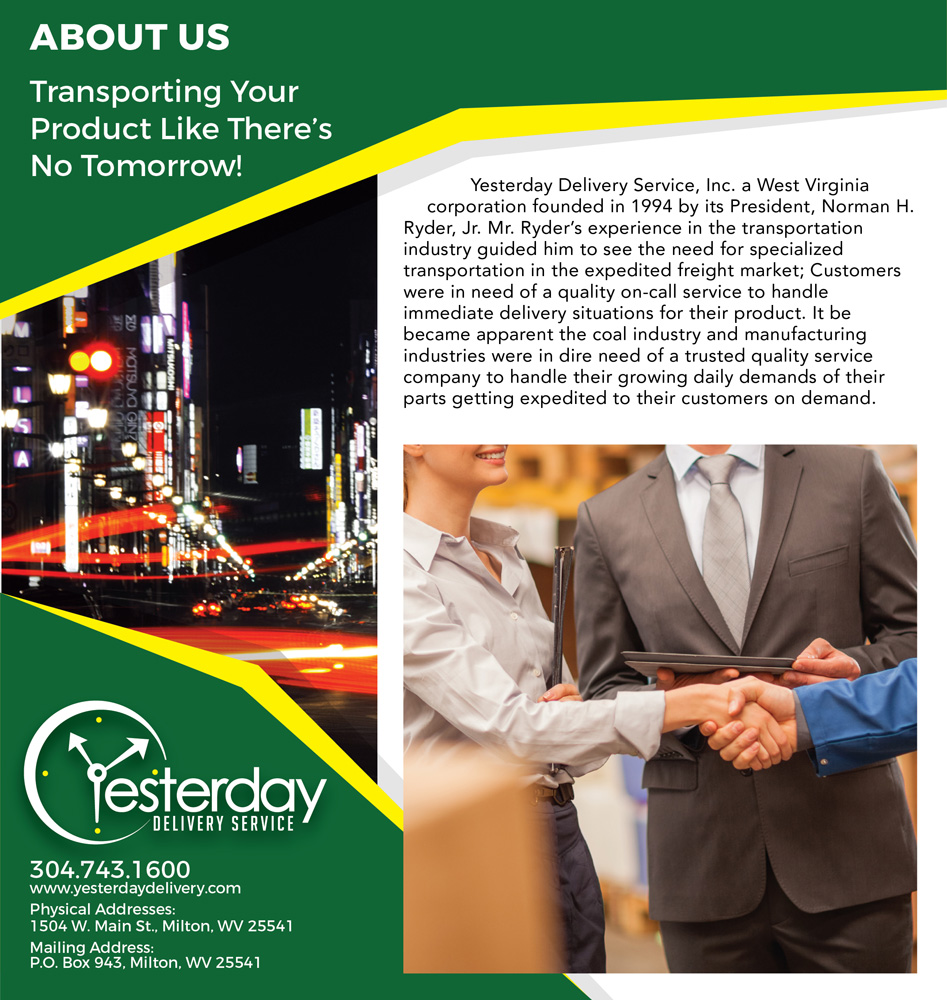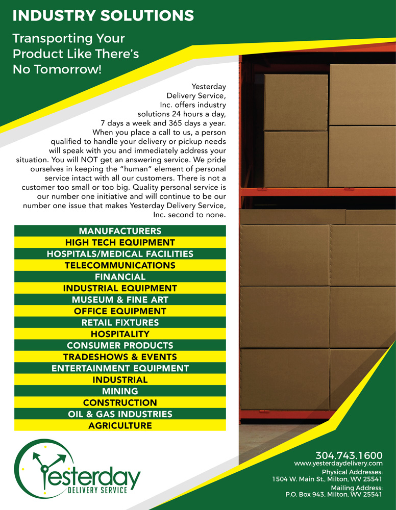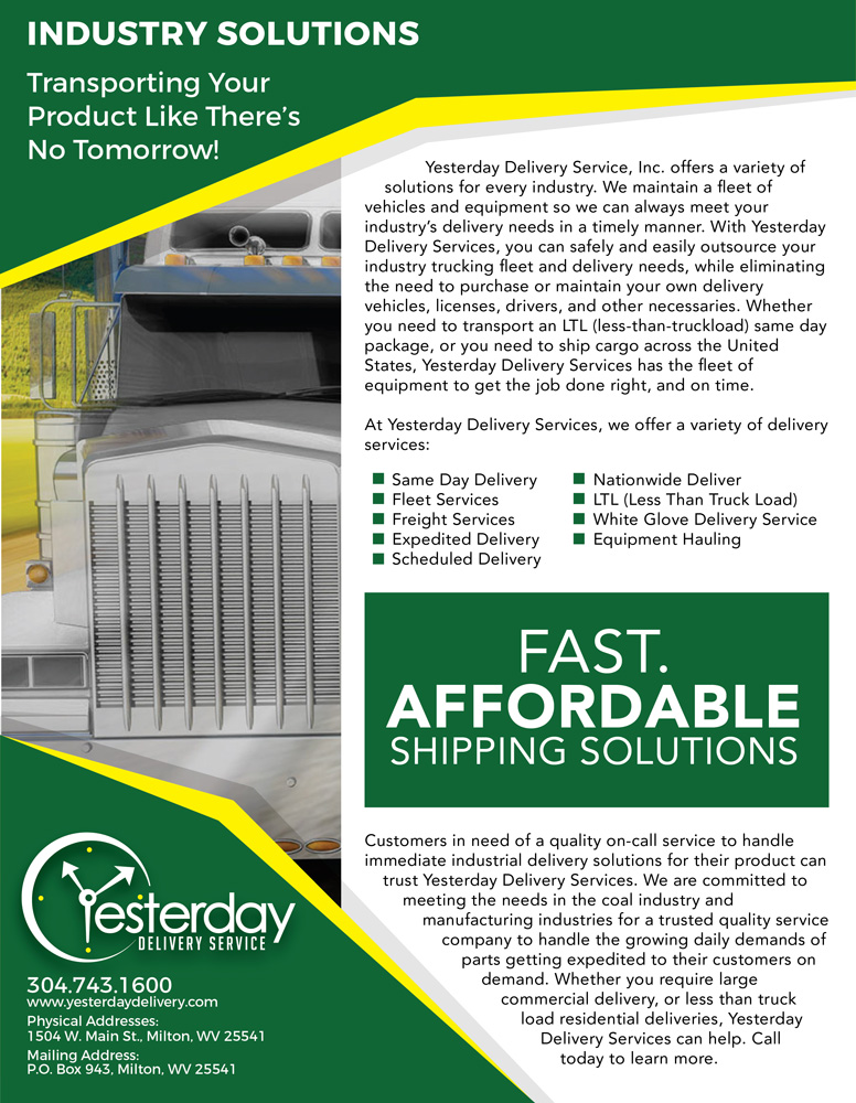 Customers in need of a quality on-call service to handle immediate delivery situations for their product can trust Yesterday Delivery Services. We are committed in meeting the needs of the coal industry and manufacturing industries. We understand the need for a trusted quality service company to handle the growing daily demands of parts getting expedited to their customers. Whether you require large commercial delivery, or less than truck load residential deliveries, Yesterday Delivery Services can help.